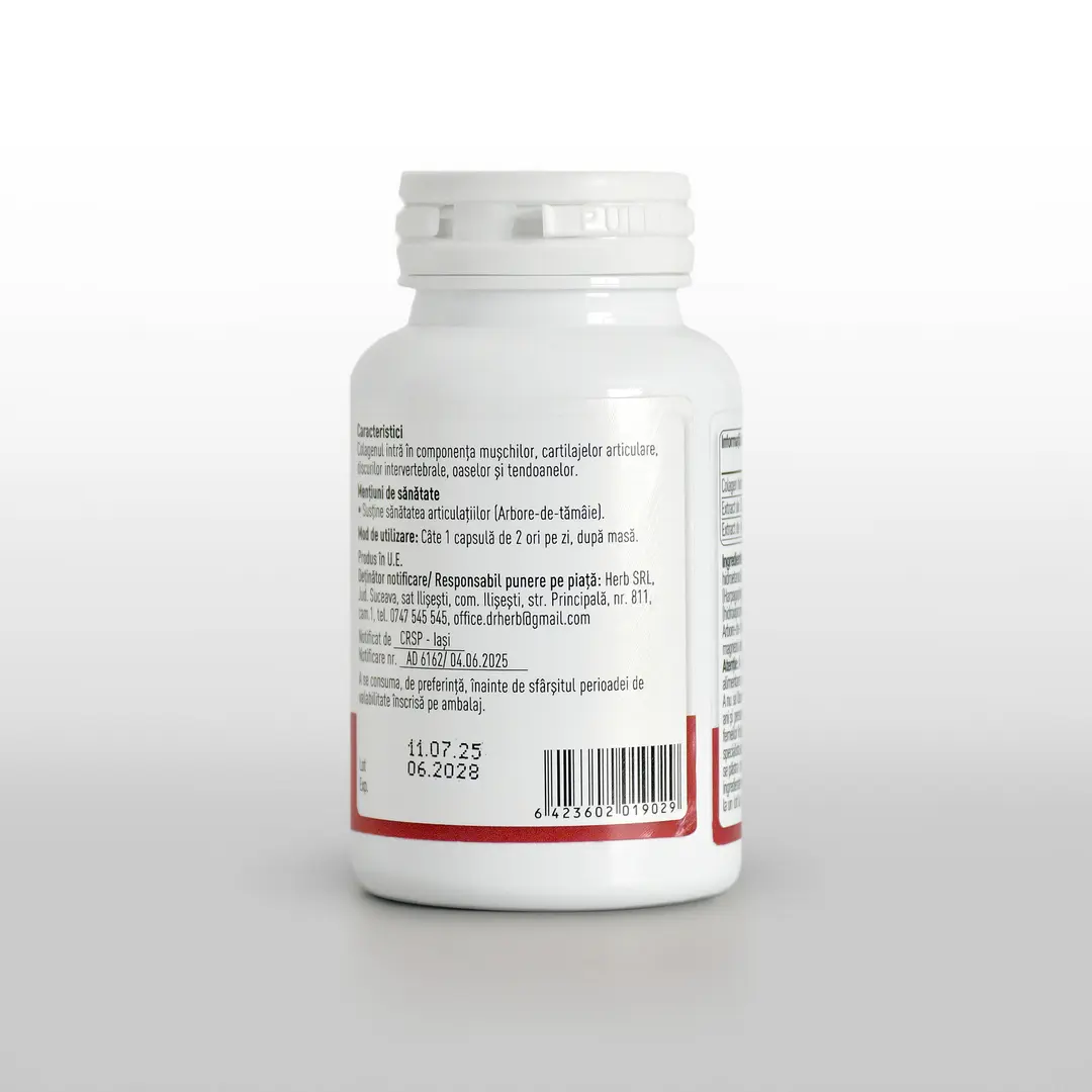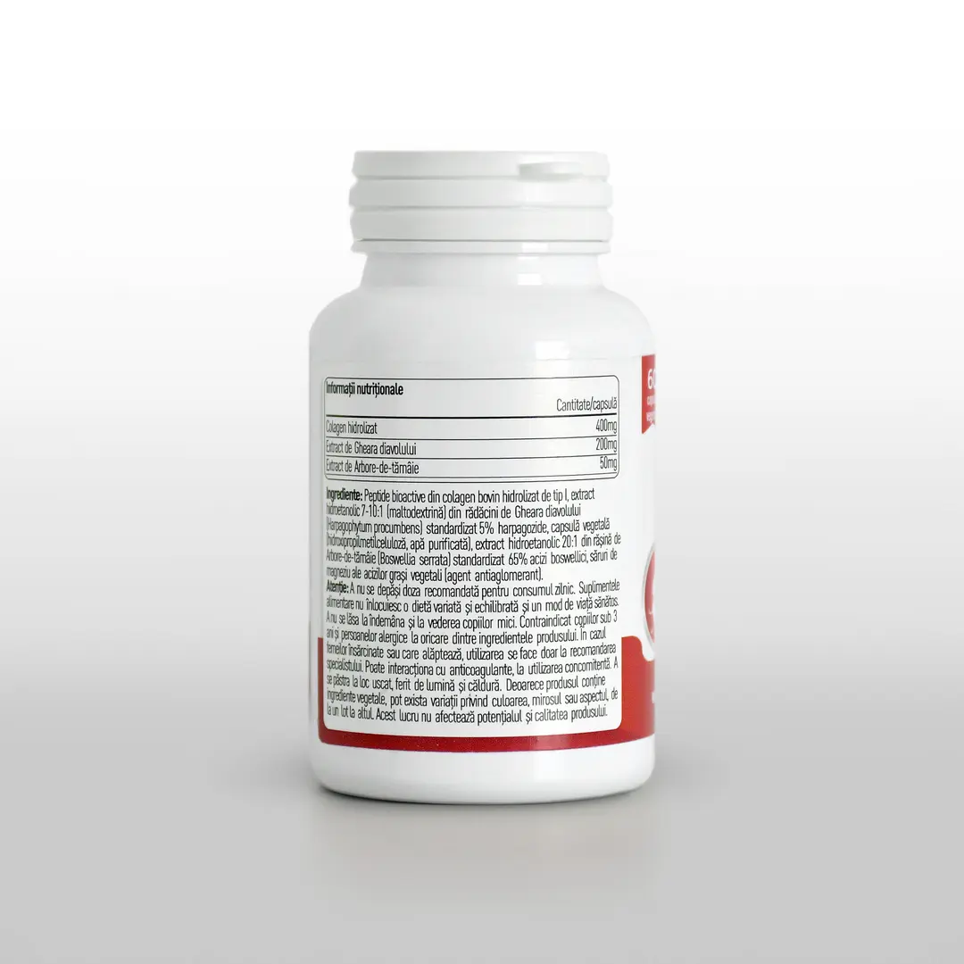 pe capsule:Colagen hidrolizat 400mg, Extract de Gheara-diavolului 200mg, Extract de Arbore-de-tămâie 50mg